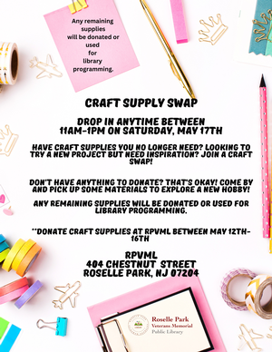 Roselle Park Veterans Memorial LibraryMay 17, 11:00 AM Have craft supplies you longer need? Join us for a craft swap.